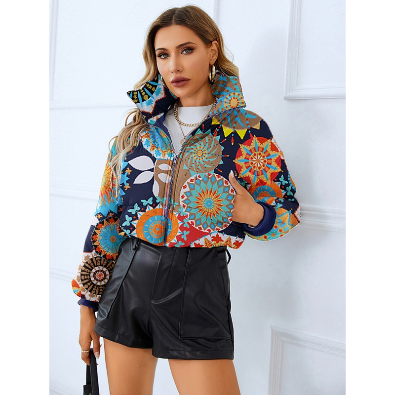 Cross-border Europe and the United States women's 2024 winter new printing fashion face cotton clothing stand-up collar bread clothing jacket Warm cotton