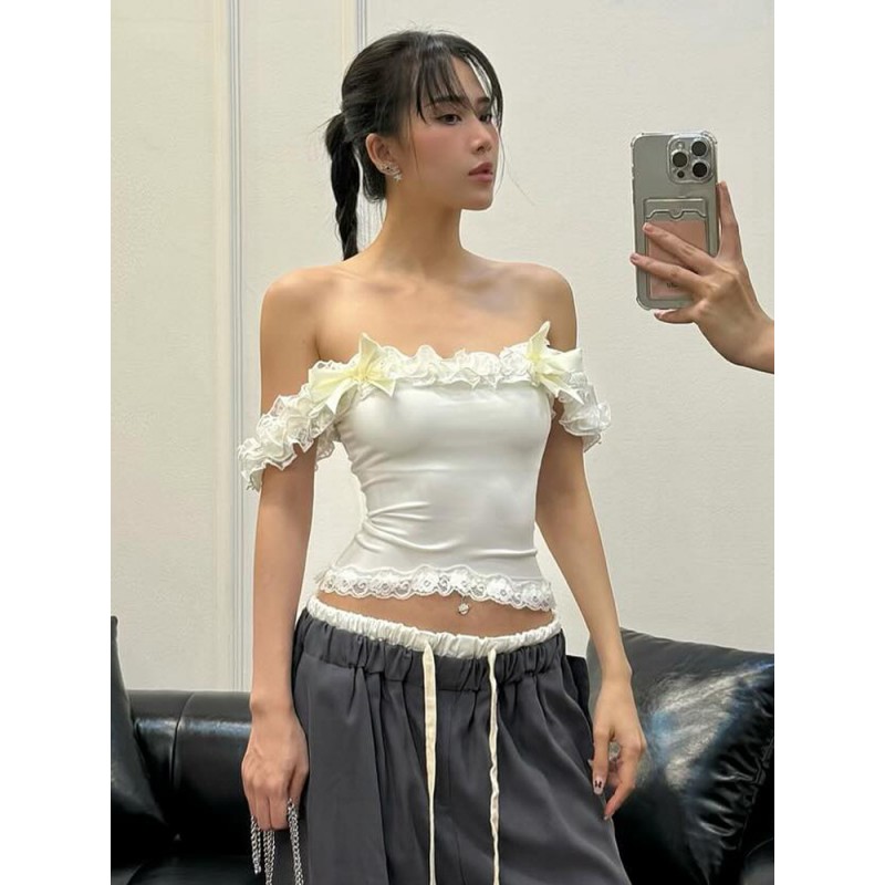 European and American style 2024 spring and summer women's clothing new sweet and spicy pure desire lace one-shoulder collar pleated sexy suspenders small vest for women
