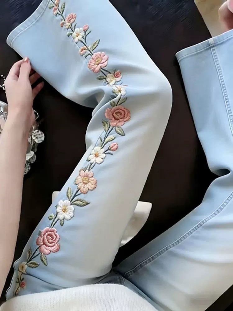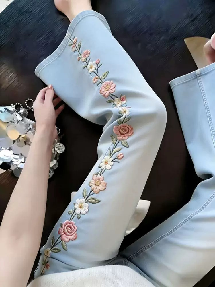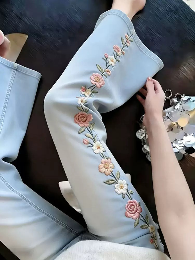 Light Blue Embroidered Floral Denim Pants for Women - 2026 Summer New Arrival: High-Waisted, Stylish, Slimming, and Versatile Cropped Pants